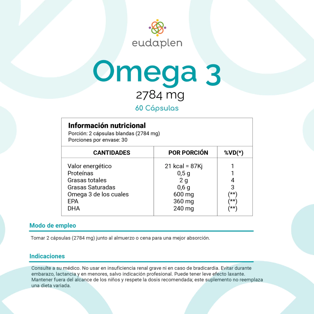 Omega-3 Eudaplen aporta una combinación concentrada de EPA (Ácido Eicosapentaenoico) y DHA (Ácido Docosahexaenoico), los dos ácidos grasos esenciales más relevantes para la salud integral. Esta fórmula está diseñada para cubrir los requerimientos diarios con solo dos cápsulas, asegurando alta biodisponibilidad, pureza y eficacia.